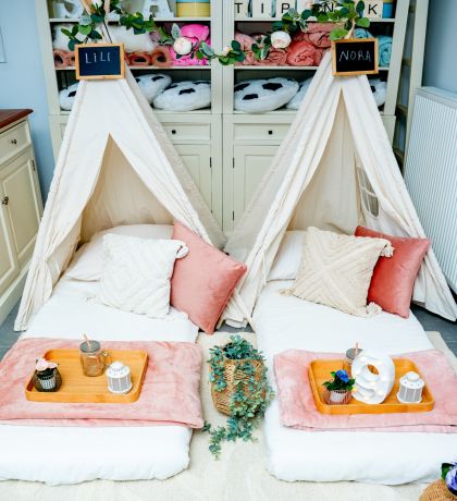 Offrez à vos enfants ou ados une soirée pyjama unique sous un tipi intérieur décoré dans un style bohème. Ambiance chaleureuse, couleurs naturelles et détails élégants pour une expérience cosy et tendance